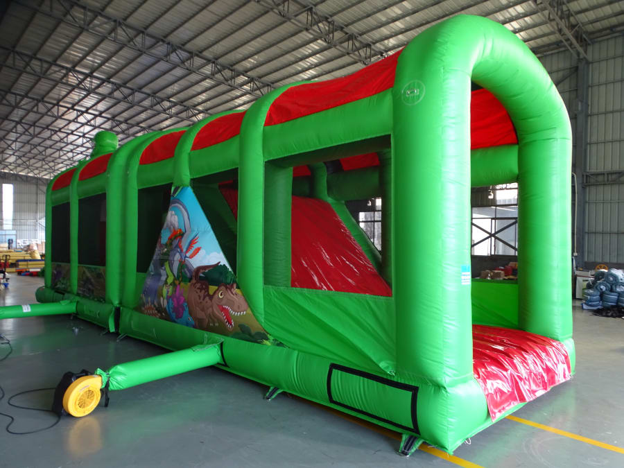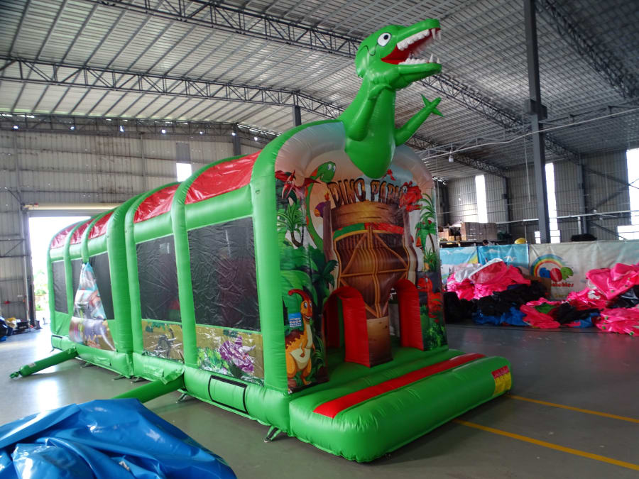 let them have there own jurasic world for there special occassion ,ok you had the bouncy castle,well this is a big step up,packed with different obstacles and tunnels they can hide from each other easily ,or bash each other in the bish bash section,but if they do manage to make it through the first part they still have it all to do ,because they have to make it up the massive slide and back down again,this obstacle is really great value suitable for all ages,and fully covered.
